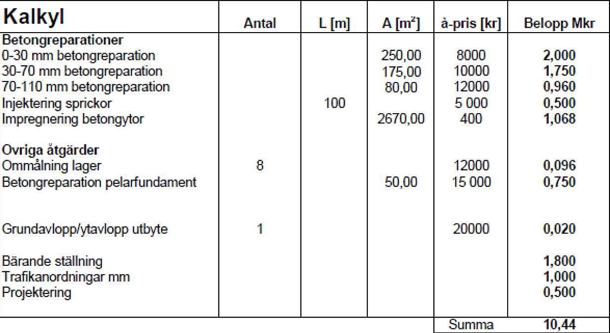 Tidigare kostnadskalkyl från 2020 används för en kostnadsbedömning. Där finns redovisat kostnader för reparation av skador på bron samt kostnad för förstärkning av brobaneplattan. Förstärkning av brobaneplattan bör utföras i samband med utbyte av tätskikt och beläggning och genomföras genom en pågjutning med betong. Pågjutningen armeras för att förstärka överkant brobaneplattan i tvärled. Vi har hämtat kostnader från A-prislista för åtgärder 2023 som finns i BaTMan:s biblioteket för att räkna upp kostnader från 2020.