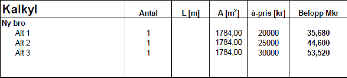 Nedan följer en överslagsmässig kalkyl för reparation av anslutande broar respektive nya anslutande broar.