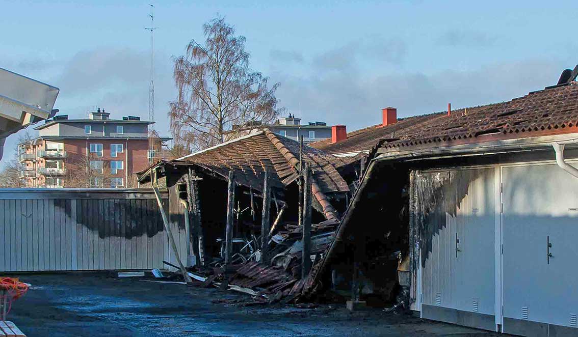 Vid ettiden i natt kom larm om brand i en garagelänga på Vråenvägen i Värnamo och tio bilar skadades.