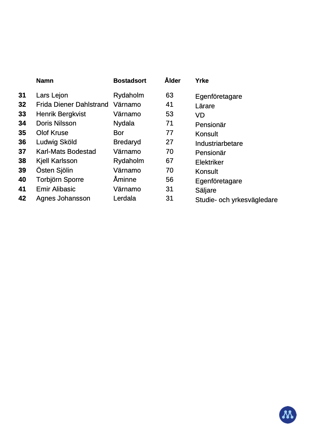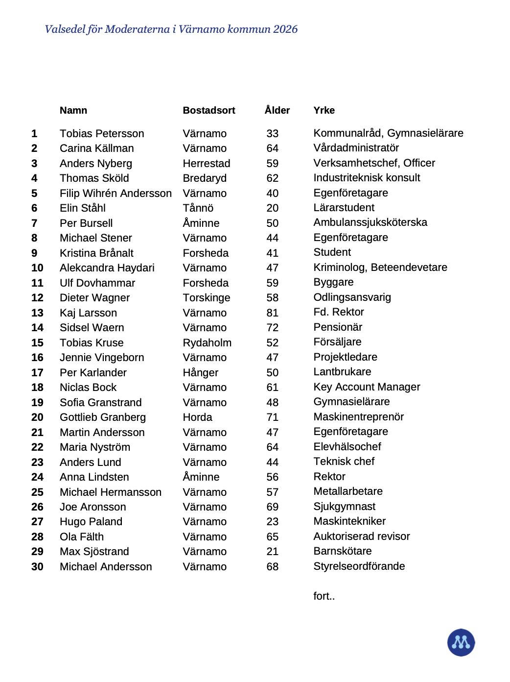 Listan toppas av kommunstyrelsens ordförande Tobias Pettersson, som under mandatperioden har lett kommunen med stabilitet och tydligt fokus på ordning och reda i ekonomin, förbättrad service och stärkt företagsklimat.