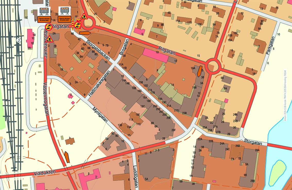 Under tiden som arbetet pågår stängs det berörda arbetsområdet av med grindar och varningsskyltar sätts ut mot både Järnvägsgatan och mot rondellen där Jönköpingsvägen och Pilgatan möts.