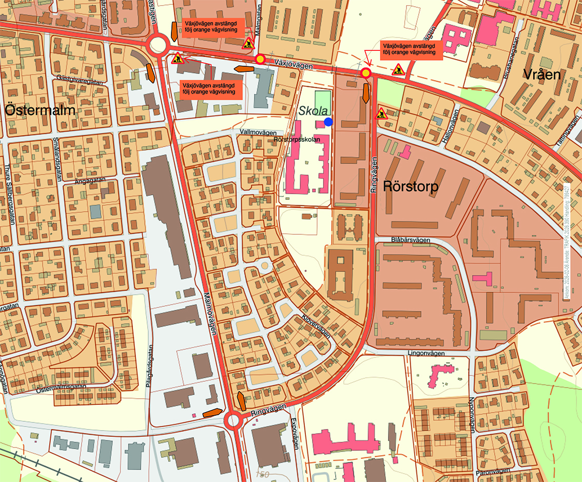 Under tiden som arbetet pågår sätts varningsskyltar ut vid rondellen där Växjövägen möter Malmövägen och vid korsningen där Växjövägen möter Ringvägen.