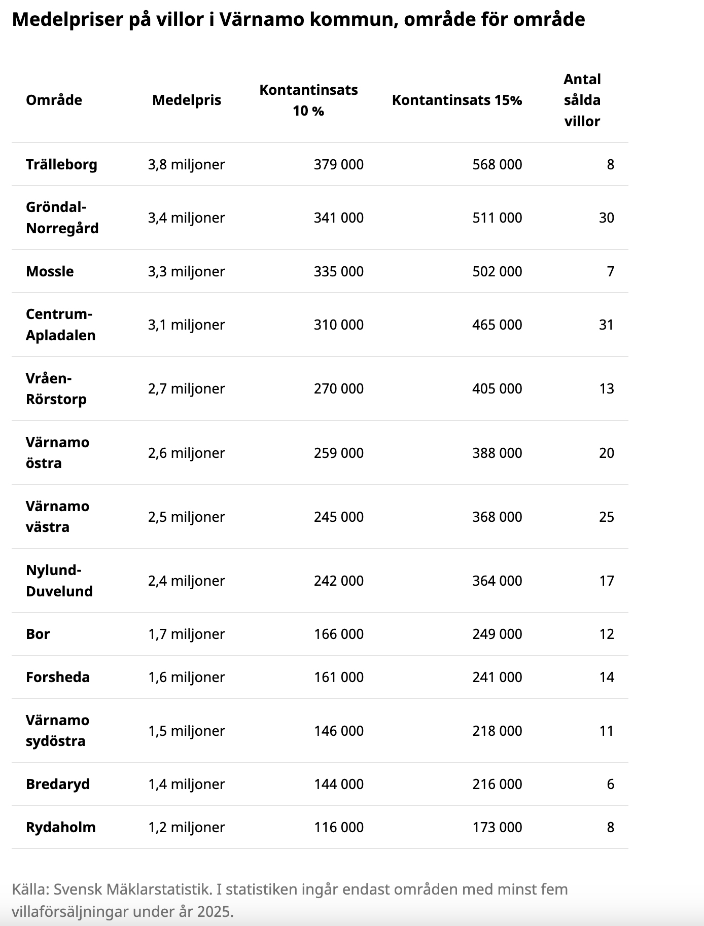 Dyrast är villor i området Trälleborg där medelpriset landade på 3,8 miljoner kronor förra året. I andra änden av skalan finns Rydaholm, där medelpriset för en såld villa var 1,2 miljoner kronor. Det skiljer alltså knappt 3 miljoner kronor mellan det dyraste och billigaste området i kommunen.