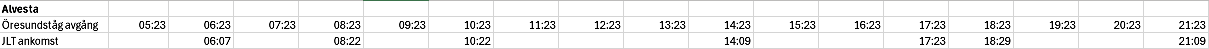 – Öresundståg AB ägs av Region Blekinge, Region Halland, Region Kalmar, Region Kronoberg, Region Skåne och Västtrafik AB. Samverkan mellan ägarna syftar till att förenkla resandet och underlätta pendlingen mellan länen, samt att med gemensamma resurser skapa långsiktigt fungerande trafik som ger god trafikekonomi och är miljömässigt hållbar. Samordningen mellan JLT:s tågtrafik och Öresundstågs avgångar från Alvesta är i det närmaste obefintlig. För närvarande ser det ut på följande sätt: