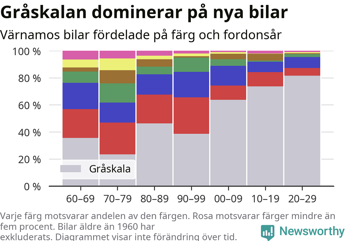 De flesta bilägare i dag väljer en bil i gråskala. Om vi enbart tittar på nyare bilar, max fem år gamla, är 82 procent i Värnamo svartvita. Motsvarande siffra för bilar tillverkade kring millennieskiftet, med tillverkningsår 1999–2004, är 56 procent.