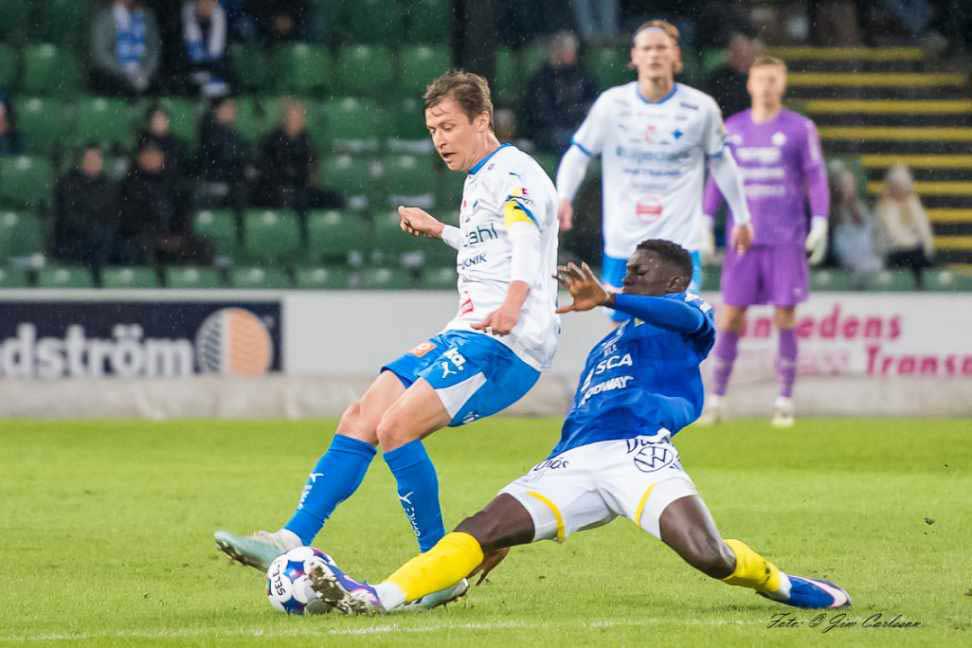 Den avige Suwaibou Kebbeh i Sundsvall har sen en fin möjlighet när han trycker bort Douglas Bergqvist i IFK men avslutet går en bit över Hugo Ketos ribba.