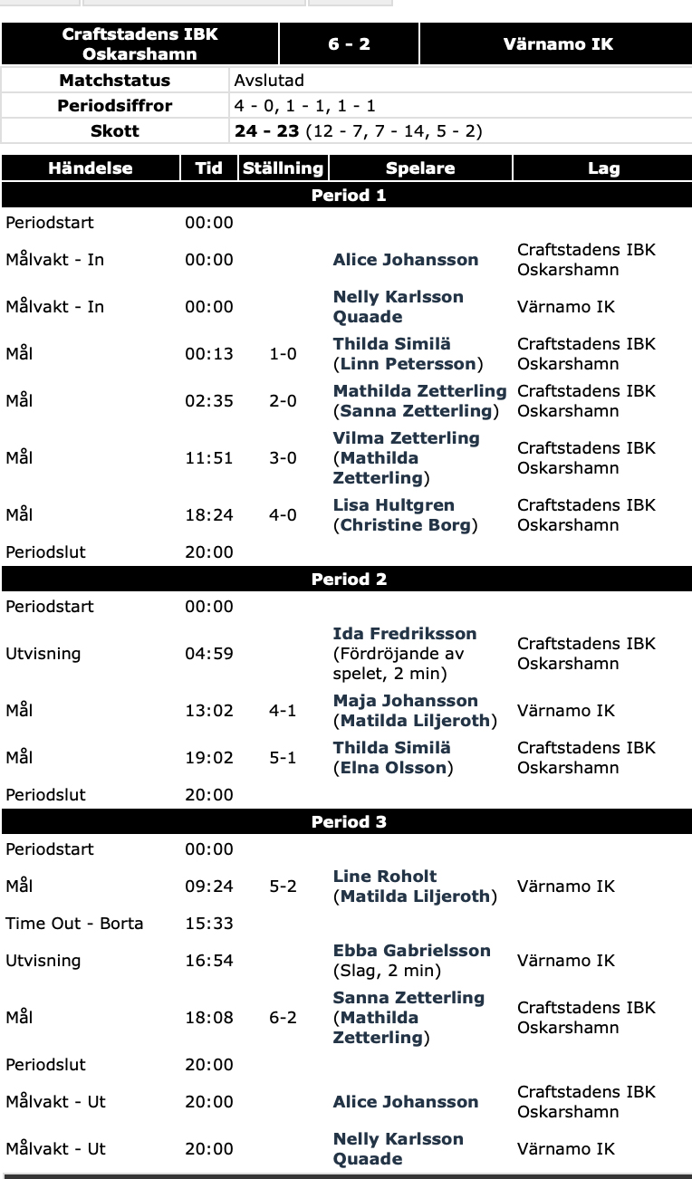 Redan efter 3.35 stod det 2–0 och i första periodvilan 4–0. Denna uppförsbacke blev för tuff för Värnamo som visserligen fortsatt med två jämna perioder men man hade det svårt med målskyttet. Kvällens enda målskyttar blev Maja Johansson och Line Roholt.