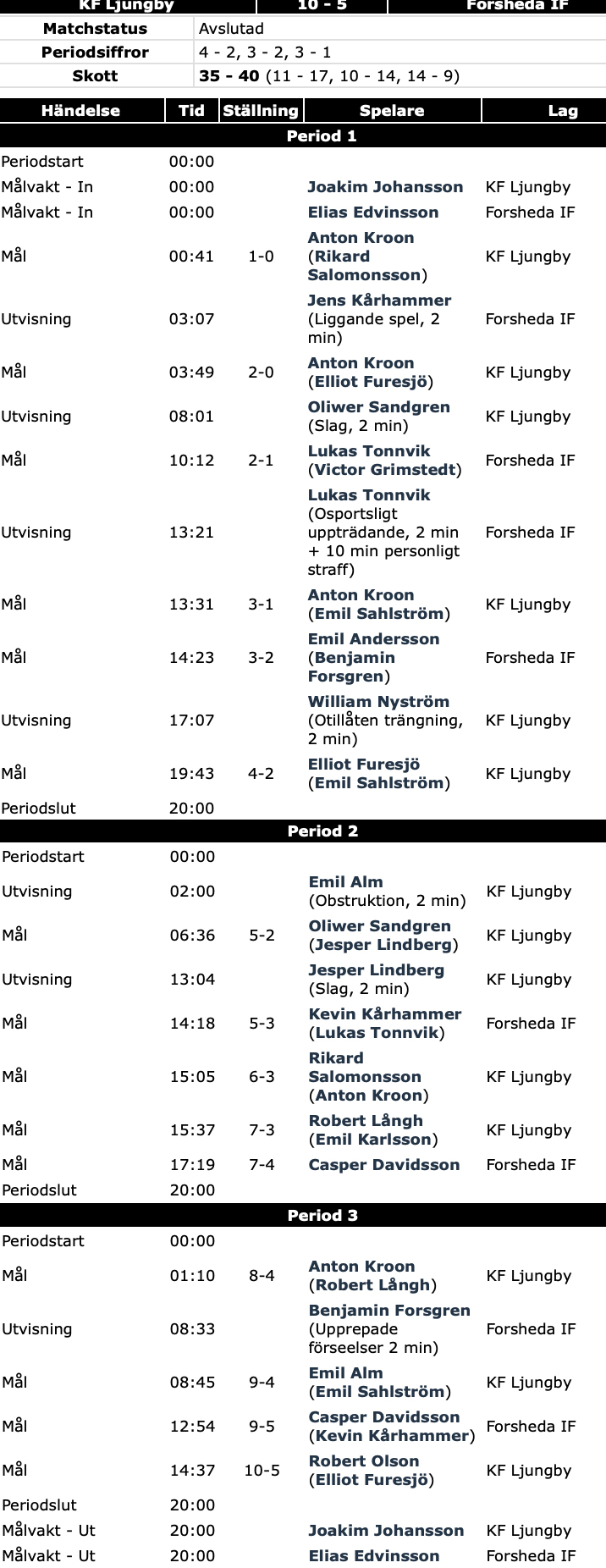 Forsheda föll med 5–10, (2–4, 2–3, 1–3) mot Ljungby.