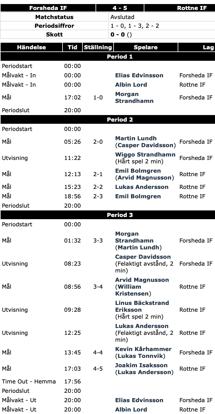 Gästerna vann med 5–4. Forsheda hade tidigt i matchen 2–0 men efter tre raka mål för Rottne blev det ändå kamp när Forsheda kvitterade.