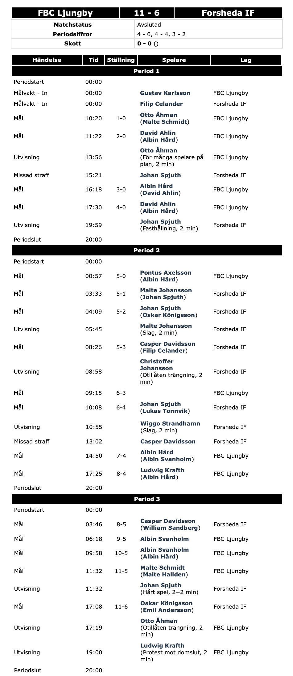 Trots fyra mål från Forsheda så räckte det inte till vinst utan Forsheda förlorade med 6–11, (0–4, 4–4, 2–3) mot tabelltvåan Ljungby.