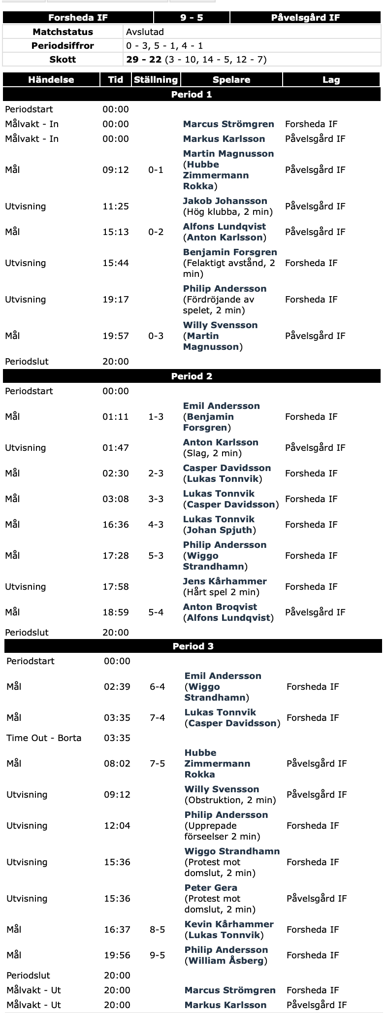 Det stod 0–3 efter den första perioden men efter halvtidsvila kom Forsheda ut som ett nytt lag och vände till 5–3. Efter reducering blev det ny pausvila och sedan åter starkt spel av Forsheda.