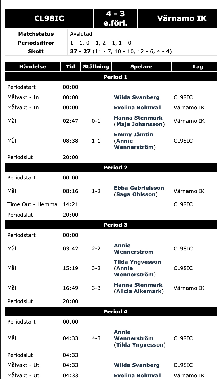 Matchen i division ett slutade 4–3. till CL 98 men segermålet kom först efter förlängning med blott 27 sekunder kvar att spela.
