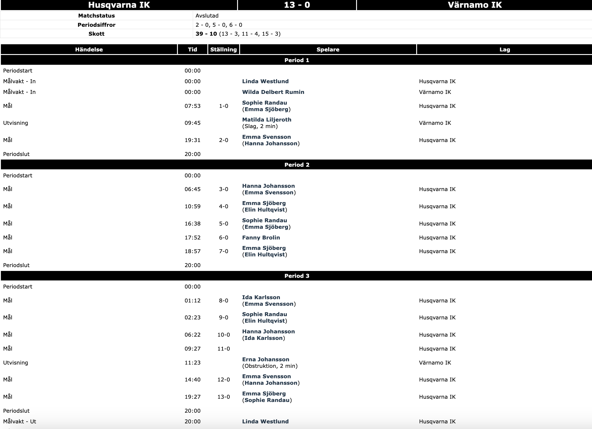 VIK släppte bara in två mål i första perioden men sedan ökade Husqvarna tempot och VIK:s damer kunde inte hänga med utan förlorade med 0–13, (0–2, 0–5, 0–5).