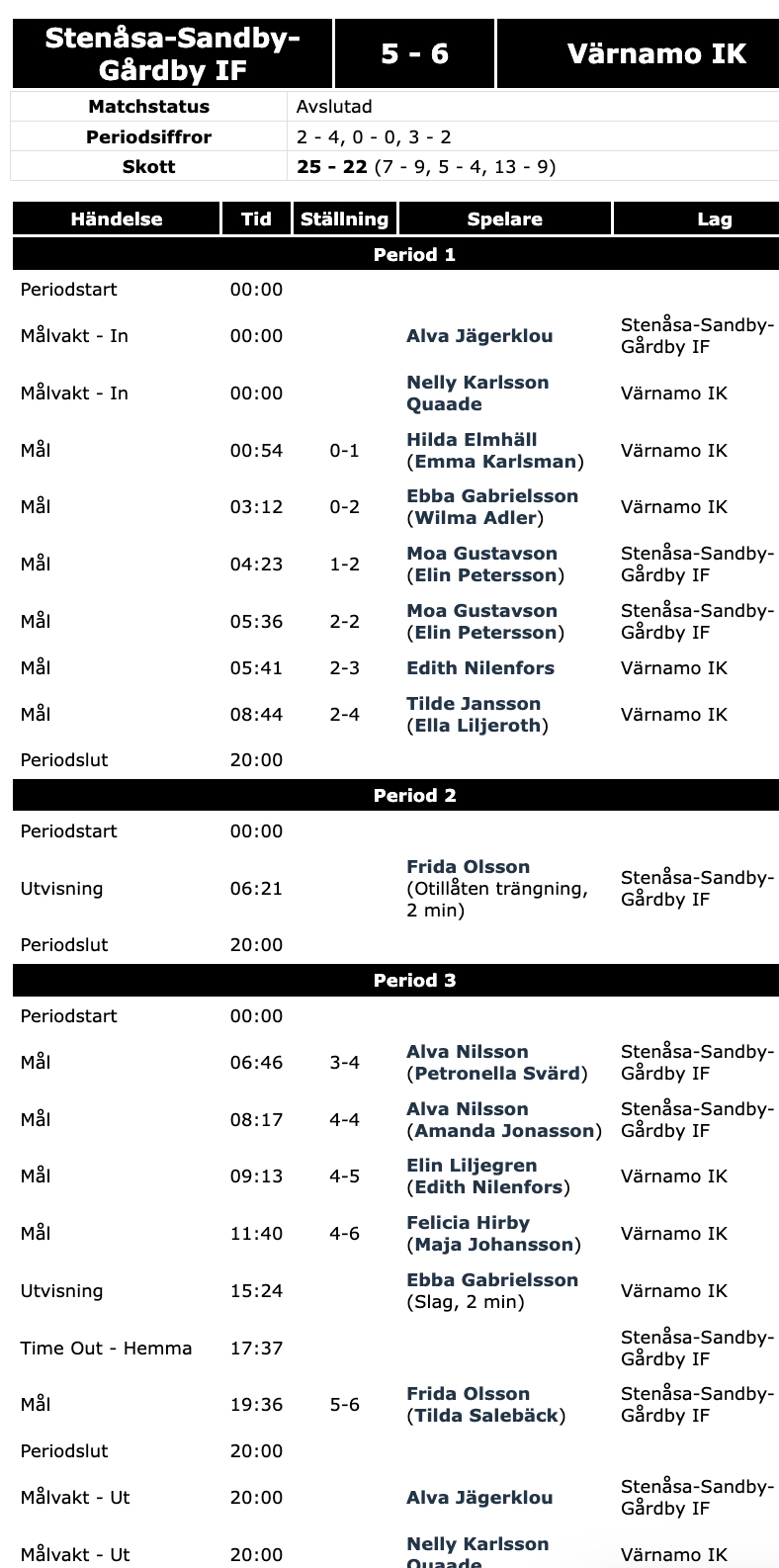 Efter en mållös andraperiod så var det Stenåsa–Sandby–Gårdby som var hetast och spelade upp sig till 4–4. I mitten av perioden utökade Elin Liljegren och Felicia Hirby till 6–4 men när motståndarna reducerade i 19:e minuten så blev det nervöst.