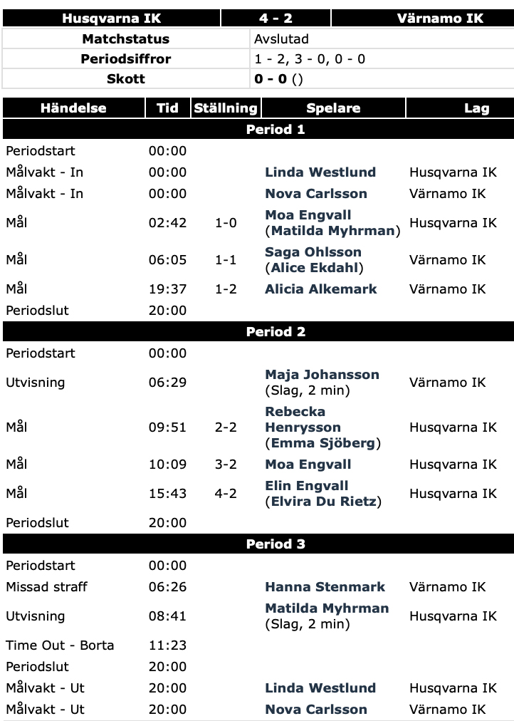 I andra perioden gick hemmalaget fart på spelet och gjorde på sex minuter tre raka mål fram till 4–2. Fler mål blev det inte i matchen.