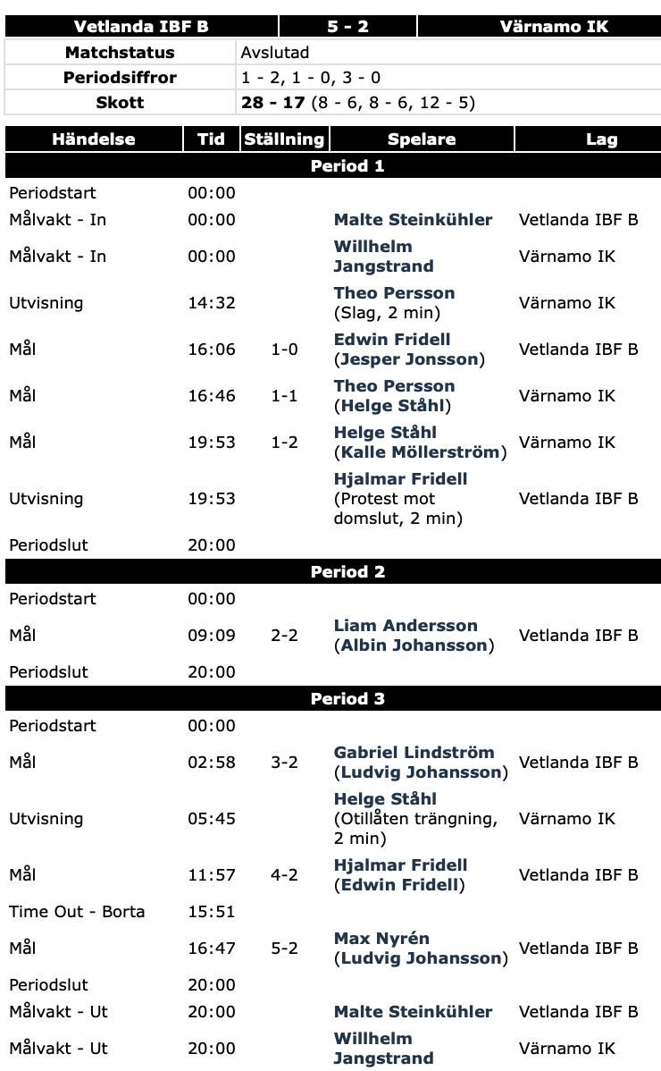 Matchen i herrtrean var jämn in i den tredje perioden men då verkade Vetlanda ha en extra växel att ta till. 2–2 blev 5–2. Värnamo hade behövt poäng, sist som man är i serien.