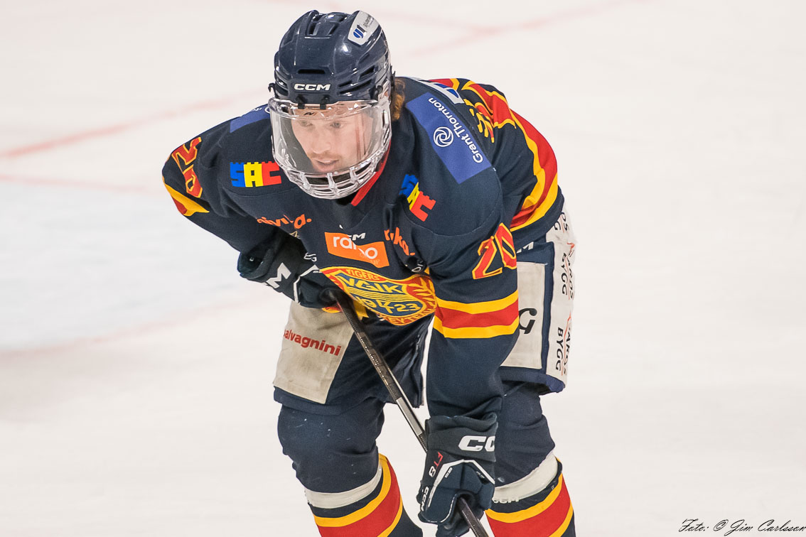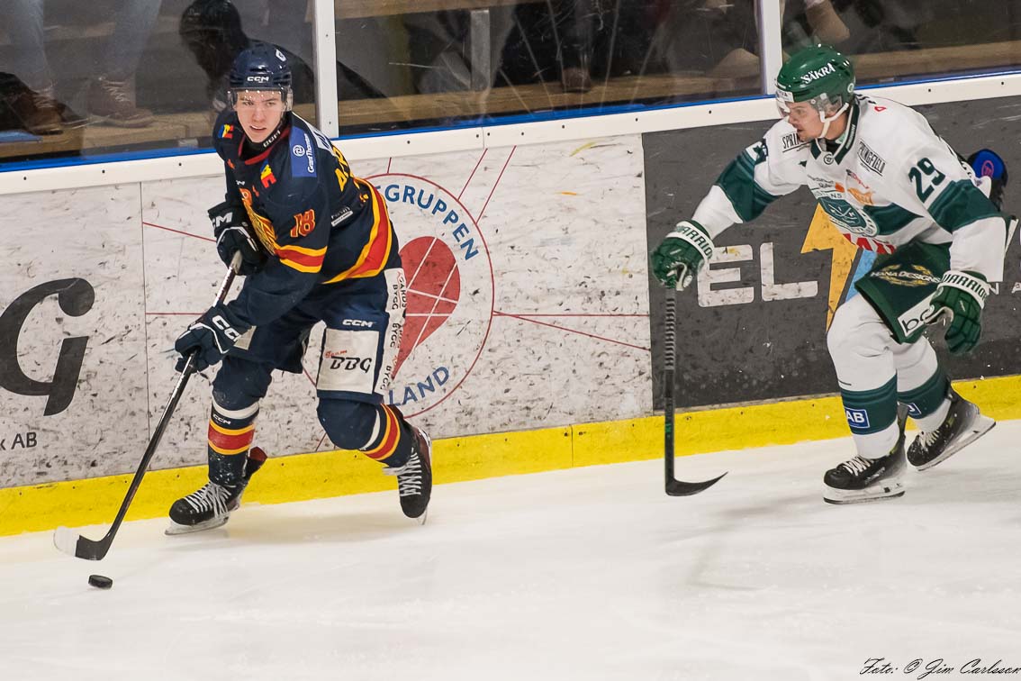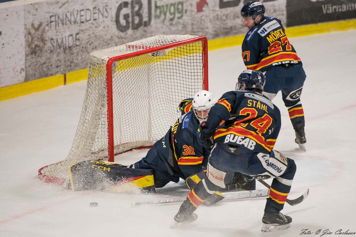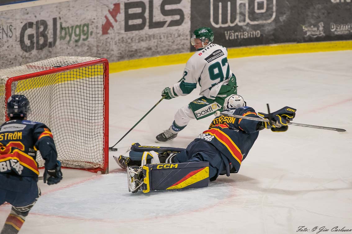 – I andra perioden är det fortfarande lite upp och ner. Vi jobbar hårt, men det är inte fullt synkat. Det är mycket kamp och individuella prestationer som håller oss kvar. Och där måste jag lyfta målvakten Jonathan Petersson – när Jonte storspelar ger han oss chansen att vara med. Han kliver fram i avgörande lägen, tar några riktigt viktiga räddningar och inger ett lugn i laget. Det betyder mycket.