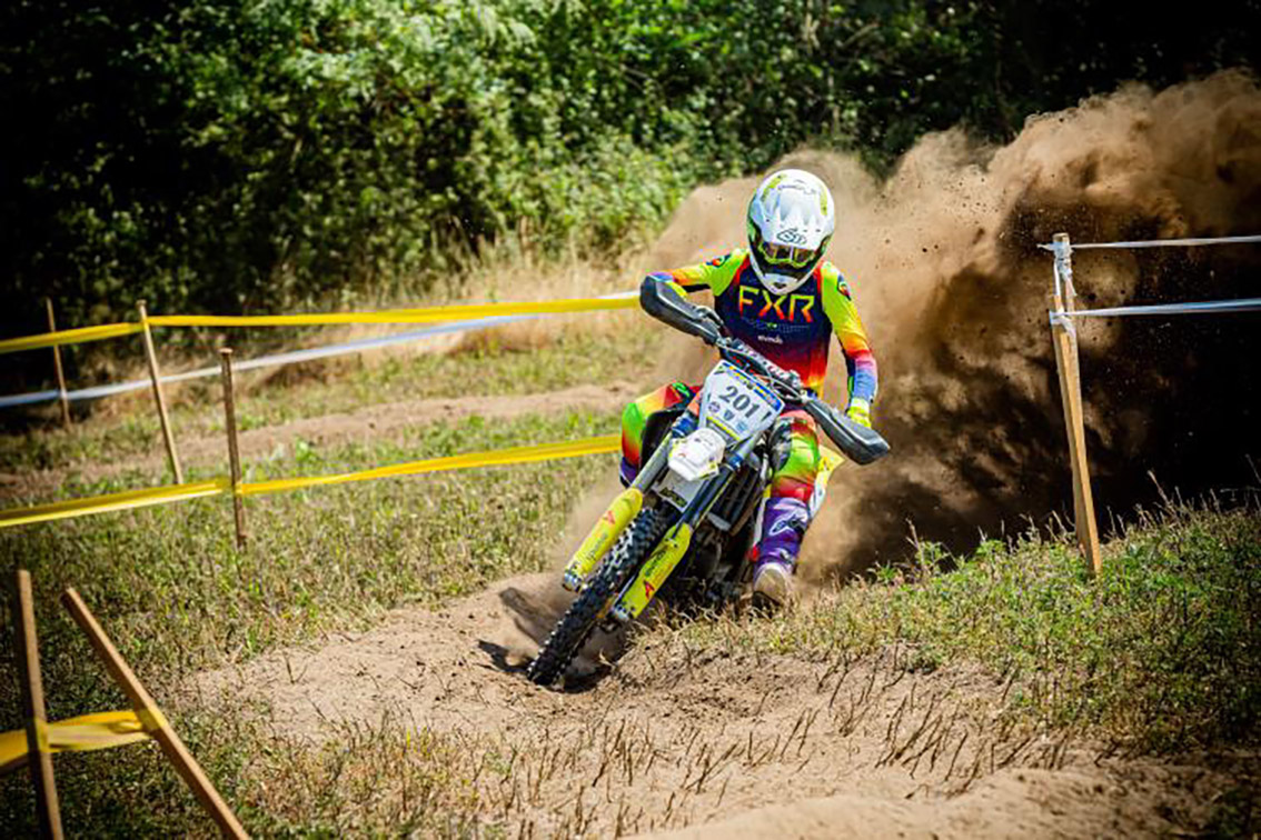 – Enduroprovet bestod av varierat underlag i gräsgärde, skog, flodfåra och brutalt branta backar. Crossprovet var dammigt och halt – en riktig utmaning för greppet, skriver Douglas pappa Fredric Sjöblom i ett mejl till redaktionen.